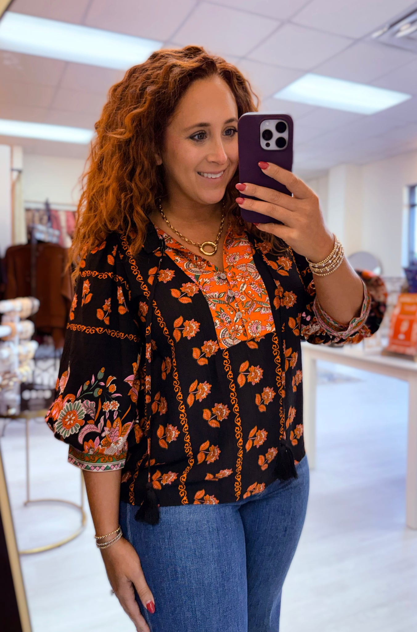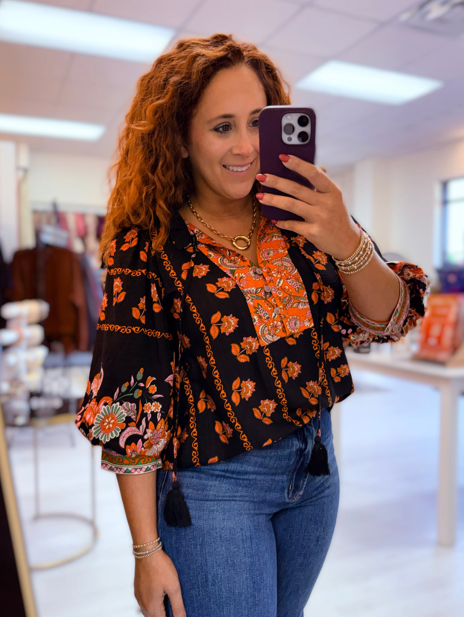 Make a statement in the Midnight Bloom Blouse. With bold orange florals blooming against a rich black backdrop, this blouse brings effortless drama to your look. The ruffled neckline, boho tassel ties, and vibrant cuff details add just the right amount of flair. Pair it with denim, leather, or wide-leg trousers for a look that’s chic and unforgettable.