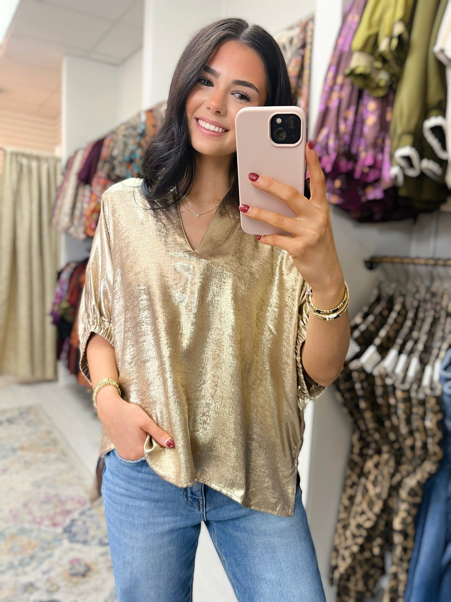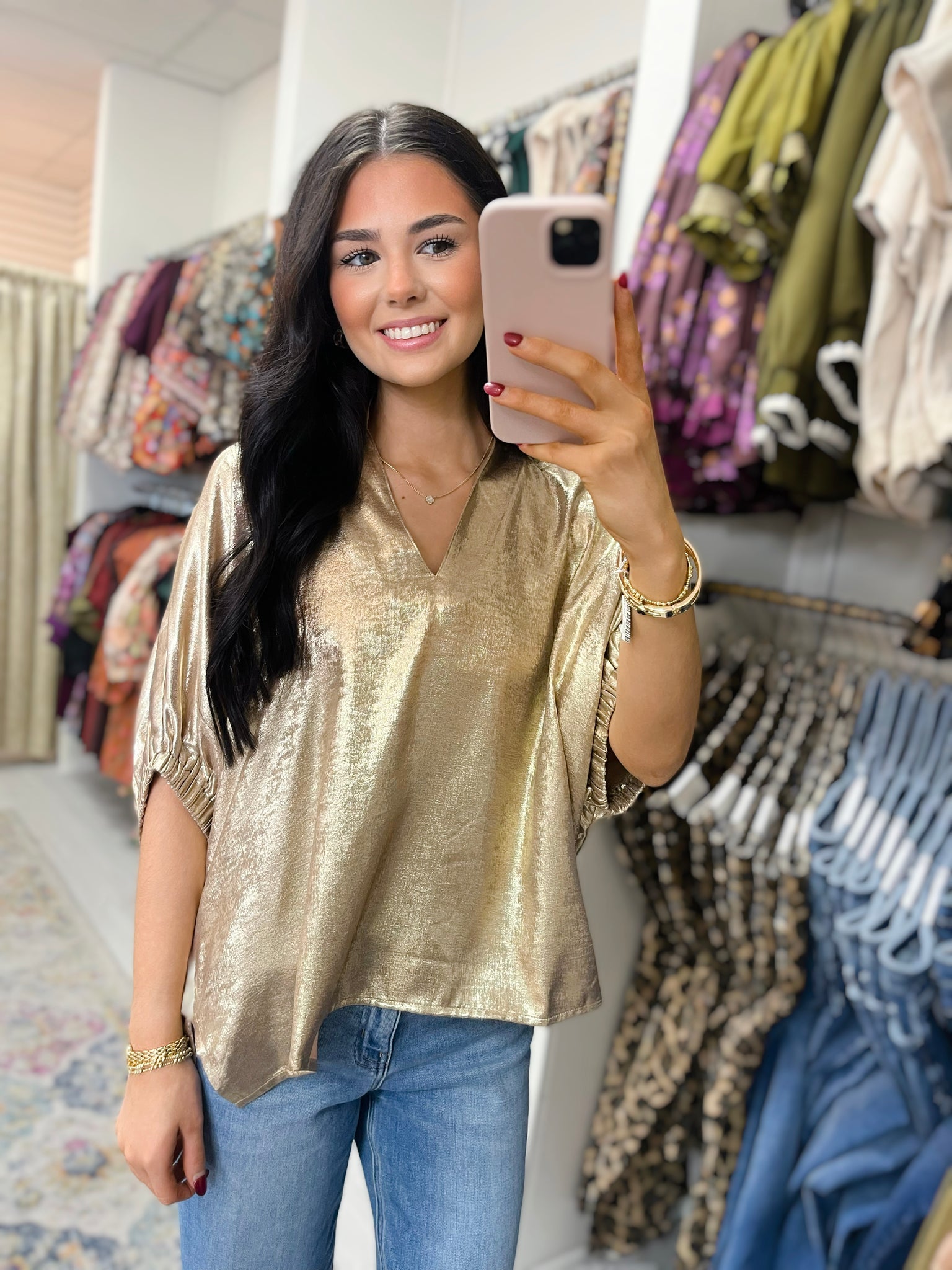 Step into the spotlight with the Shimmer & Shine Top. Designed with a metallic finish that catches the light beautifully, this statement blouse is perfect for holiday parties, nights out, and all your festive gatherings. The flowy silhouette and gathered sleeves keep it flattering and comfortable, while the collared neckline adds just the right touch of polish. Available in Gold for bold radiance, Champagne for subtle glam, and Charcoal for an edgy sparkle.