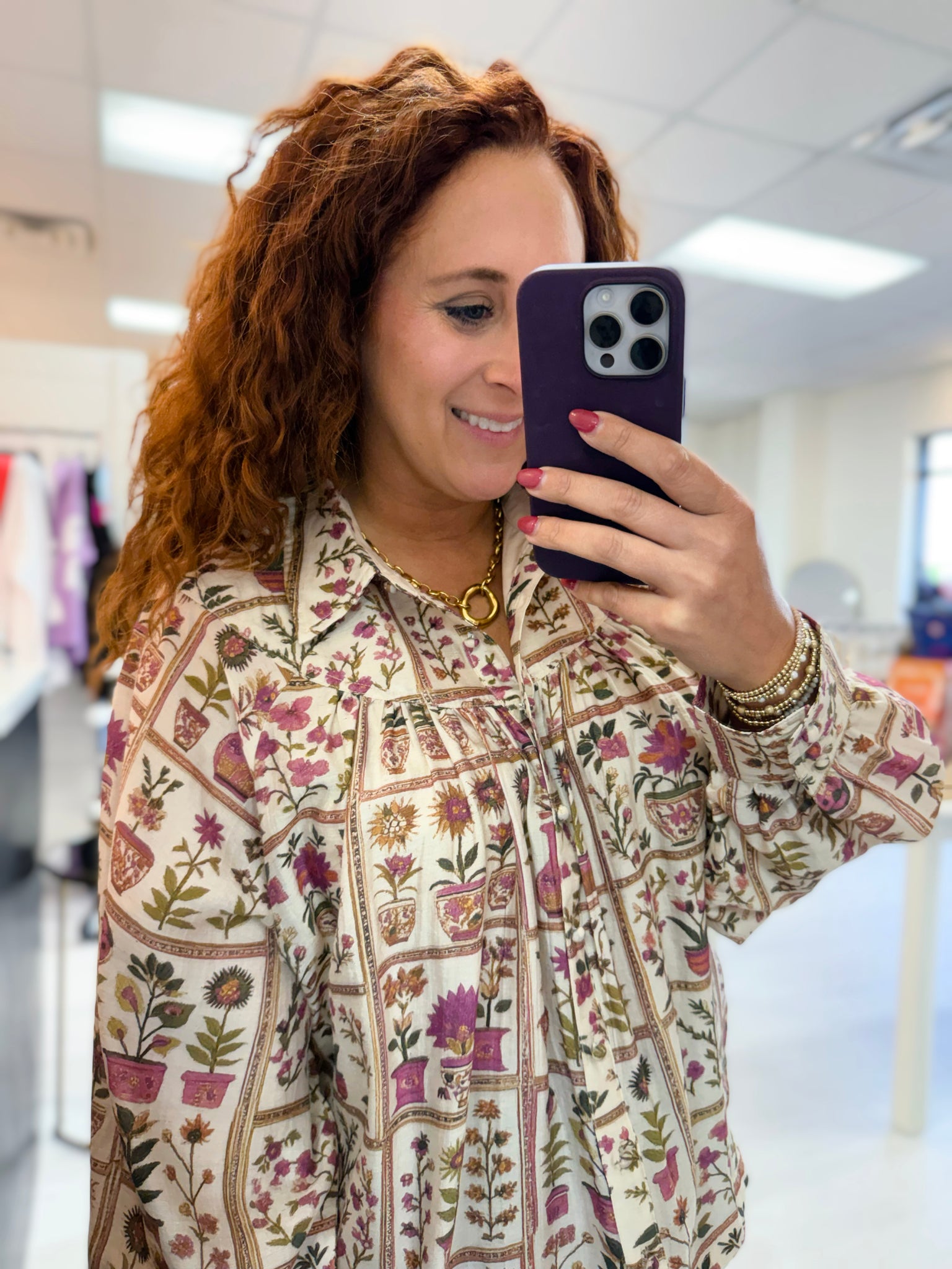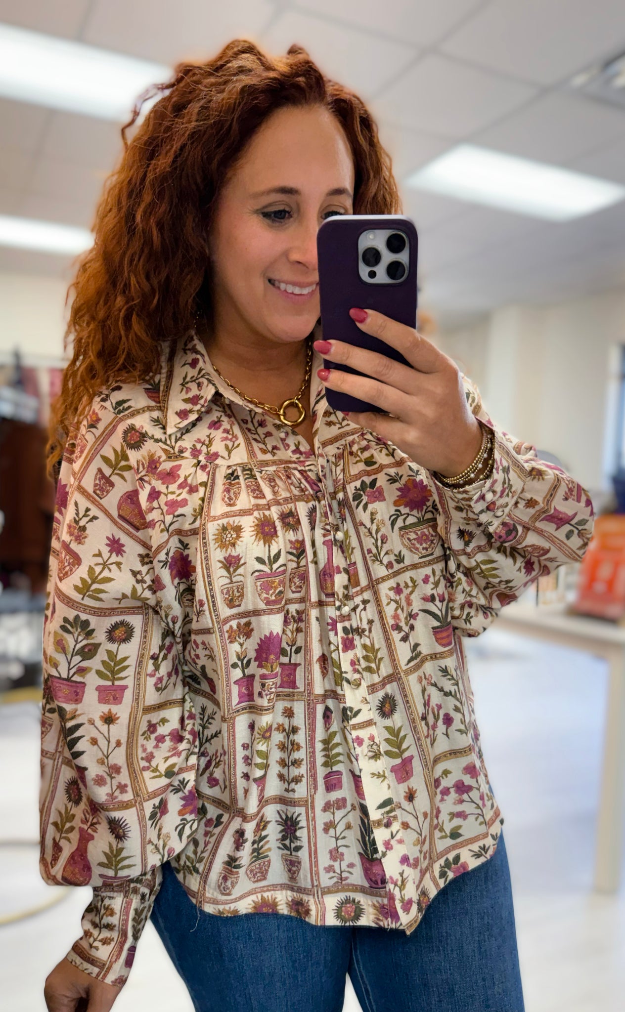 Bring a touch of garden elegance into your wardrobe with the Botanical Charm Blouse. Featuring a delicate print of blooming florals in vintage-style potted frames, this lightweight blouse is effortlessly chic. The soft pleating at the bust adds a feminine touch, while the collared neckline and relaxed fit make it perfect for pairing with denim, trousers, or layered under a cozy cardigan. A true statement piece for any season.